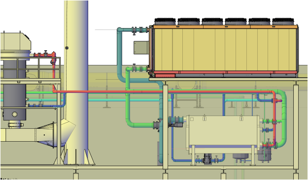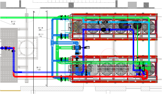 Engineering: Detailplanung einer Kühlzentrale; Planung von Abluft-, Heißwasser-, Kühlwasser-, Kaltwasserleitungen und Raumluft